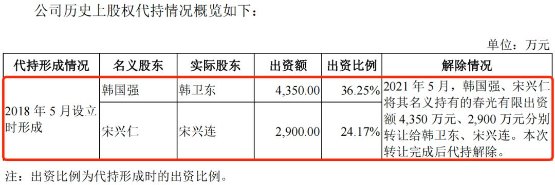招股书显示,春光有限设立时,出于商业考虑,韩国强(韩卫东之弟)、宋兴仁(宋兴连之兄)分别代韩卫东、宋兴连持有春光有限36.25%(对应注册资本4350万元)、24.17%(对应注册资本2900万元)的出资额,直到2021年5月代持才被彻底解除。