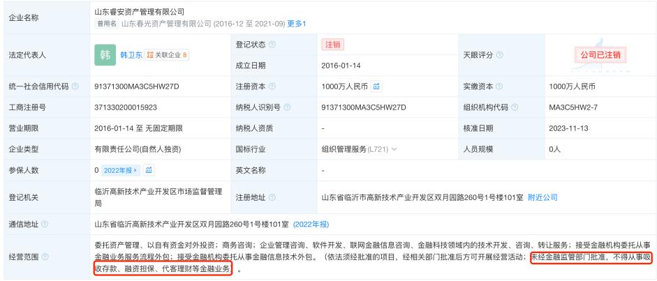 「创业最前线」注意到,韩卫东曾设立公司来进行“集资”。公开资料显示,睿安资产成立于2016年1月,是韩卫东曾持股100%,并任执行董事、总经理的企业,已于2023年11月注销。