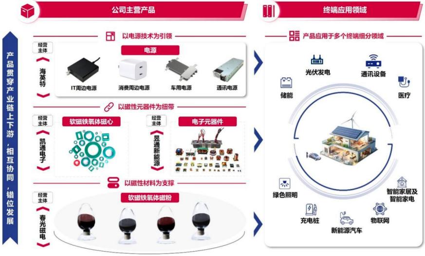 成立之后,春光集团主营业务为软磁铁氧体磁粉的研发、生产和销售,并沿产业链发展了软磁铁氧体磁心、电子元器件和电源等产品。