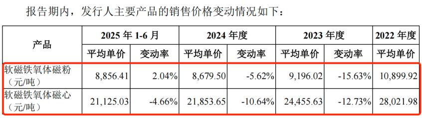 不仅如此,报告期内,春光集团的软磁铁氧体磁粉平均销售价格分别为1.09万元/吨、9196.02元/吨、8679.50元/吨和8856.41元/吨;软磁铁氧体磁心的平均销售价格分别为2.80万元/吨、2.45万元/吨、2.19万元/吨和2.11万元/吨,销售价格整体呈现下行趋势。