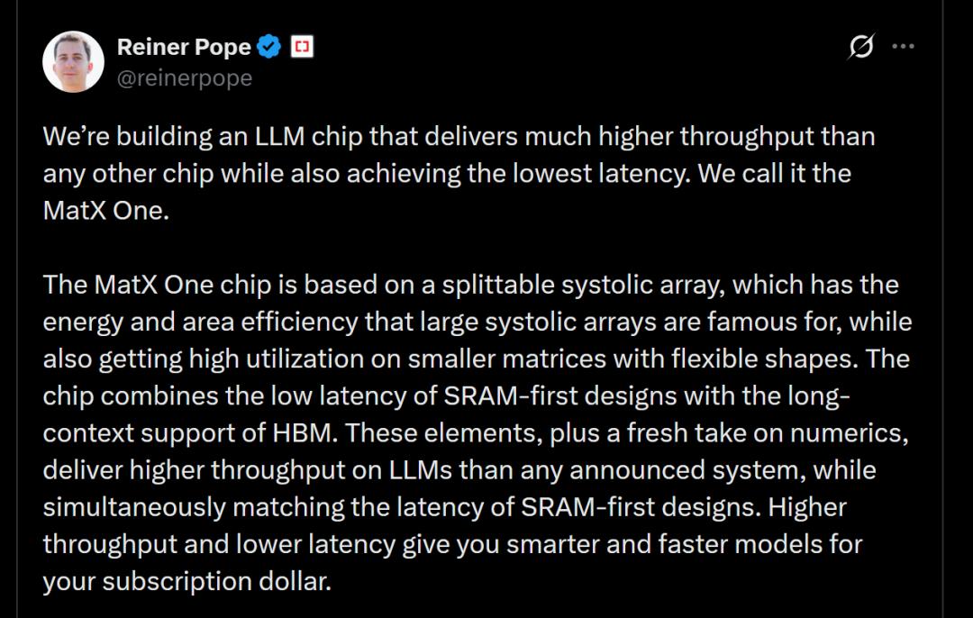 可以说,此举已经将人们对MatX One的好奇心拉满了。