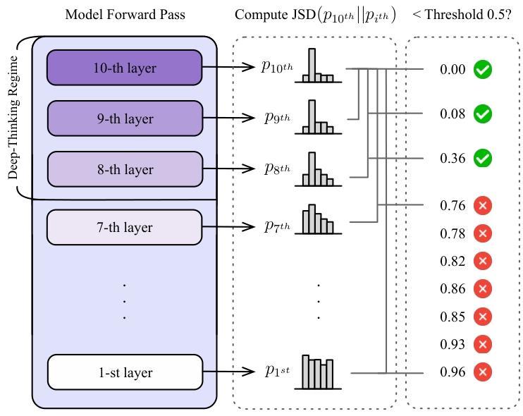 团队用JSD衡量各层预测分布的差异,如果一个token的预测直到深层网络才稳定下来,那就被判定为深度思考词。