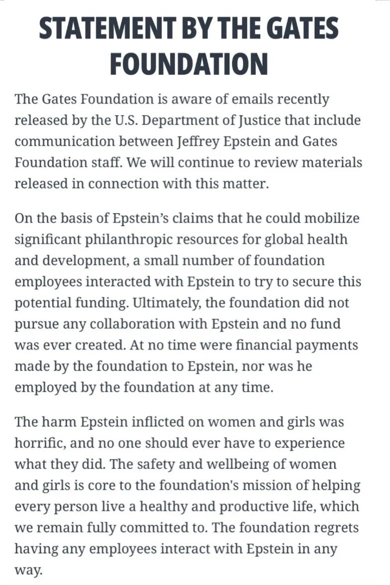 2月11日,盖茨基金会官网就卷入爱泼斯坦案发布正式声明,称基于爱泼斯坦声称他能够为全球健康和发展调动大量慈善资源,基金会少数员工曾与爱泼斯坦接触,试图争取这笔潜在资金。最终,基金会并未与爱泼斯坦开展任何合作,也从未设立任何基金。基金会从未向爱泼斯坦支付任何款项,也从未雇用过他。