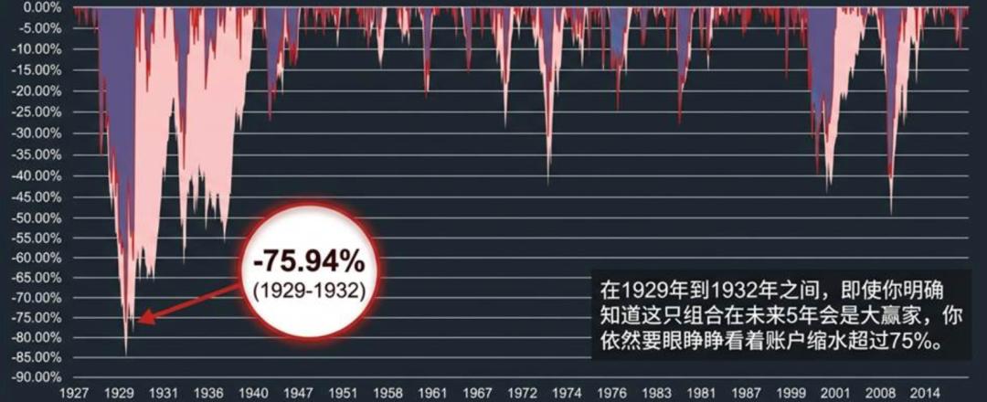 但“上帝之眼”也无法消除波动,其年化波动率仍然有22%,夏普指数也就是1.1,中间还有10次20%以上的大回撤,在某些中间年份,这个组合甚至可能出现阶段性显著跑输指数,大萧条期间最大回撤同样高达-76%。