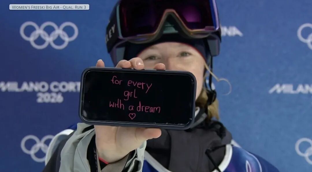 同一届冬奥会上,自由式滑雪女子大跳台资格赛结束后,德国选手穆里尔·默尔在等待分数时举起手机,屏幕上写着一句话:for every girl with a dream(献给每个有梦想的女孩)。她虽没能晋级决赛,却把属于自己的重要时刻转化成对所有女孩的鼓励。
