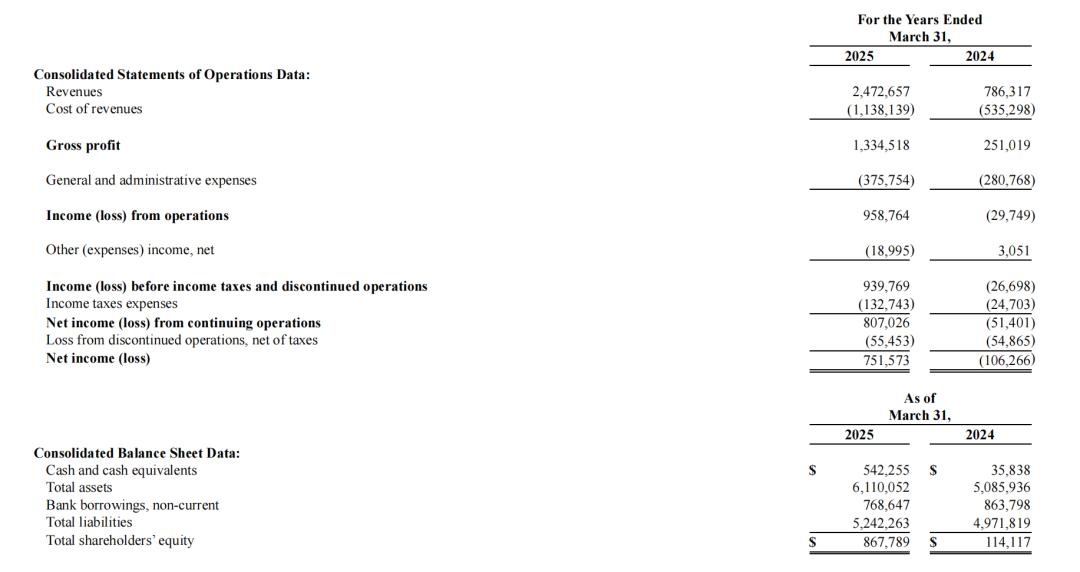 对投资者来说,汇生活的财务数据有两个核心看点:一是已经扭亏为盈,二是精准绑定了内地赴港留学的红利。财务数据显示,2024-2025 财年(截至 3 月 31 日),公司营收从 79 万美元涨到 247 万美元,同比增长超 2 倍;净利润也从上一年亏损 11 万美元,变成盈利 75 万美元。