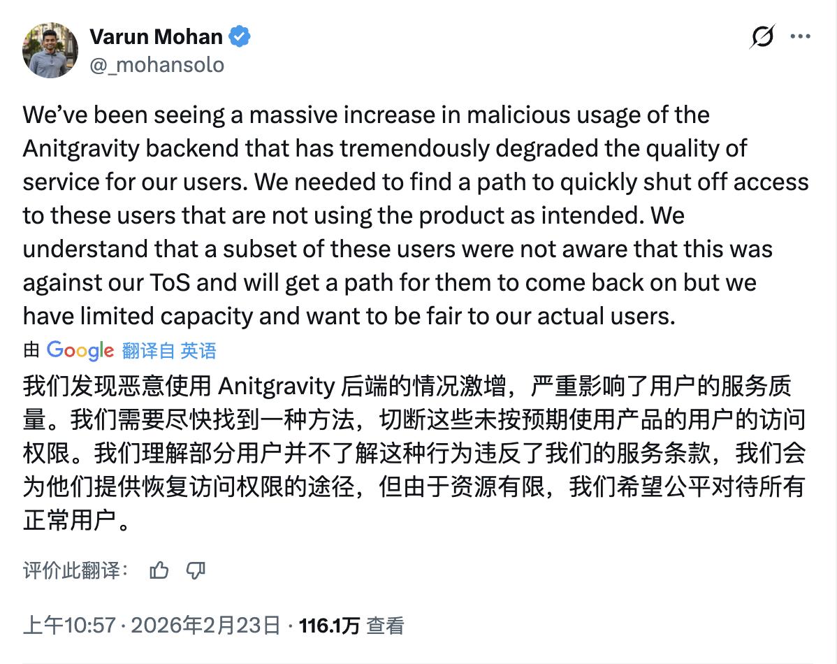 「我们发现恶意使用 Anitgravity 后端的情况激增,严重影响了用户的服务质量。我们需要尽快找到一种方法,切断这些未按预期使用产品的用户的访问权限。」