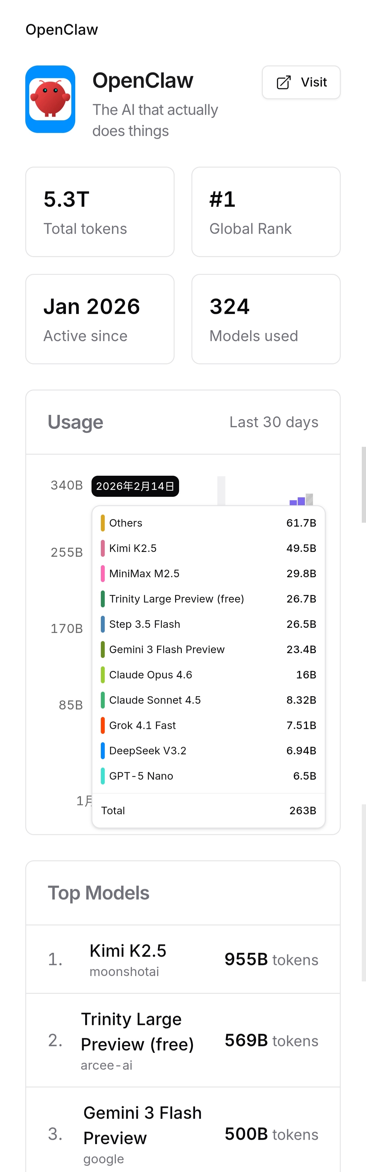 根据全球 AI 模型聚合平台 OpenRouter 的数据,现在 Kimi K2.5 已经是 OpenClaw 上调用量最大的模型。