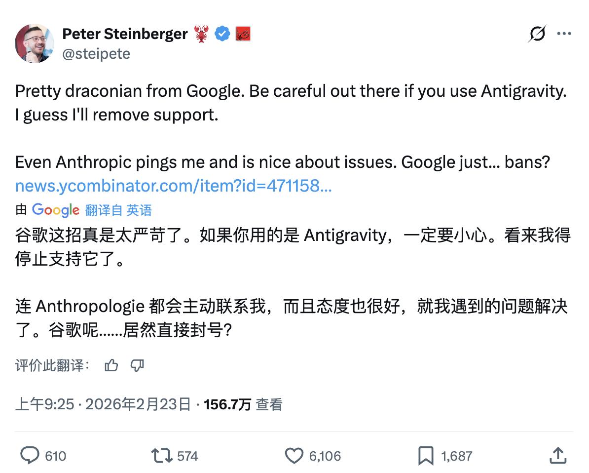 「谷歌这招真是太严苛了。如果你用的是 Antigravity,一定要小心。看来我得停止支持它了。 连 Anthropic(Claude)都会主动联系我,而且态度也很好,就我遇到的问题解决了。谷歌呢……居然直接封号?」