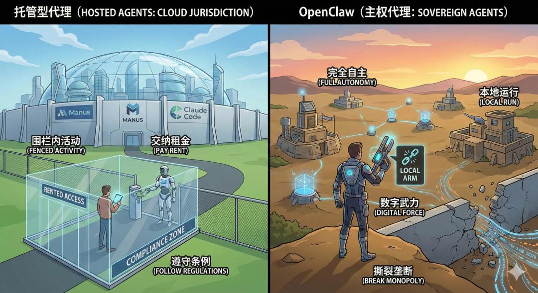 ● OpenClaw(主权代理):它完全站在用户这一边。因为它运行在本地,它更像是一个“每个人都可以持枪”的时刻。当每个个体都拥有了能够自主操作 Web、自由调用不同模型、且不被云端监视的“数字武力”时,大公司对流量、数据入口和操作路径的垄断将被彻底撕裂。这是你的一亩三分地,你可以左右它的所有行为。