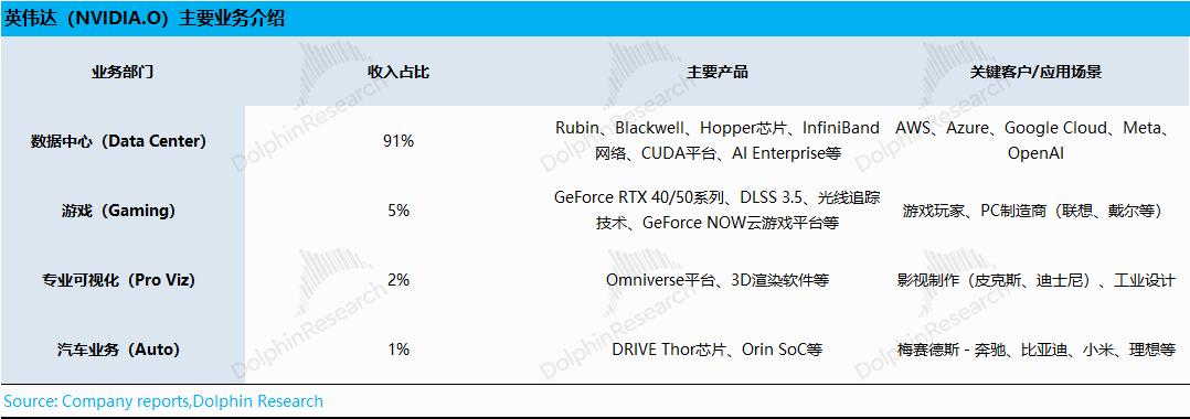 1)数据中心业务:是当前最主要的关注点,其主要产品包括Blackwell、Hopper等算力芯片,公司的核心客户是亚马逊、微软、谷歌等云服务大厂;