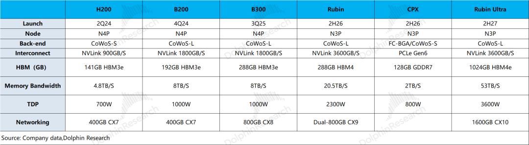 c)Rubin新产品的进展:当前英伟达的主要产品是B300系列,而公司计划将在2026年下半年推出Rubin和CPX产品,届时将开始采用台积电3nm工艺,接着公司还将在2027年继续推出Rubin Ultra产品。