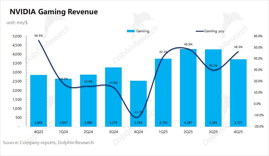 3.2游戏业务:2026财年第四季度英伟达游戏业务实现营收37亿美元,同比增长46%,主要是受公司RTX50等系列产品的出货带动。游戏业务在公司整体收入中占比已经不足一成,公司当前业绩重心依然是数据重心业务。