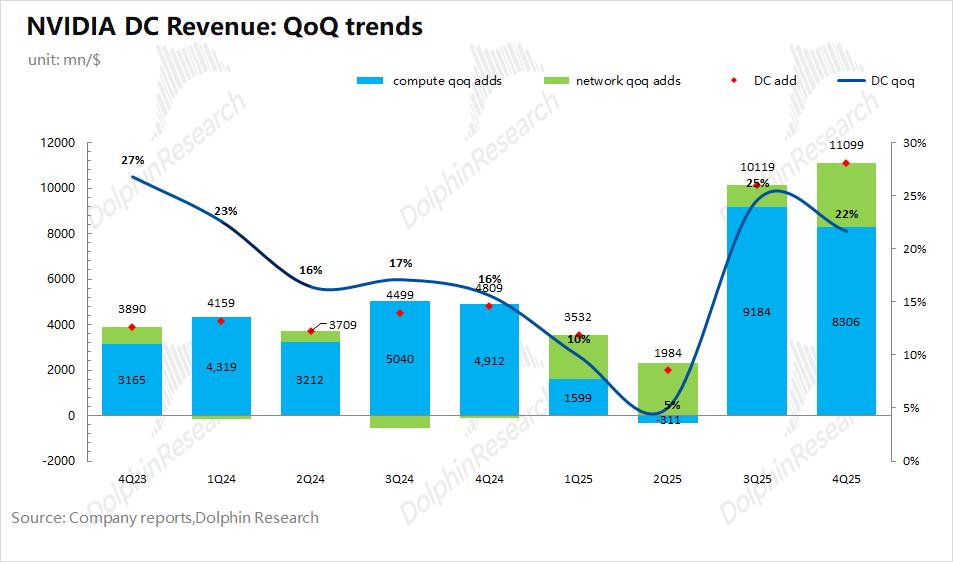 具体来看:①计算业务收入本季度为513亿美元,环比增加83亿美元,其中B300在本季度的加速量产贡献了最主要的增量;②网络业务收入本季度为110亿美元,环比增长28亿美元。