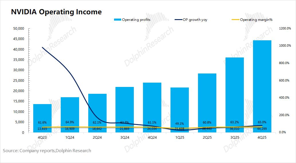 2026财年第四季度英伟达核心经营利润率为65%,继续提升,主要是受毛利率回升以及经营费用率下降的影响。