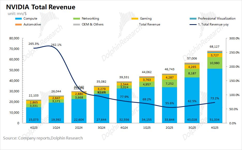 2.1 营业收入:2026财年第四季度(即4Q25)英伟达公司实现营收681亿美元,同比增长73%,好于上调后的买方预期(670亿美元)。公司本季度环比增长的110亿美元,基本上都来自于数据中心业务及Blackwell系列量产爬坡的带动。