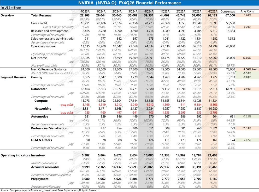 英伟达 (NVDA.O)北京时间2026年2月26日凌晨,美股盘后发布2026财年第四季度财报(截至2026年1月),具体内容如下: