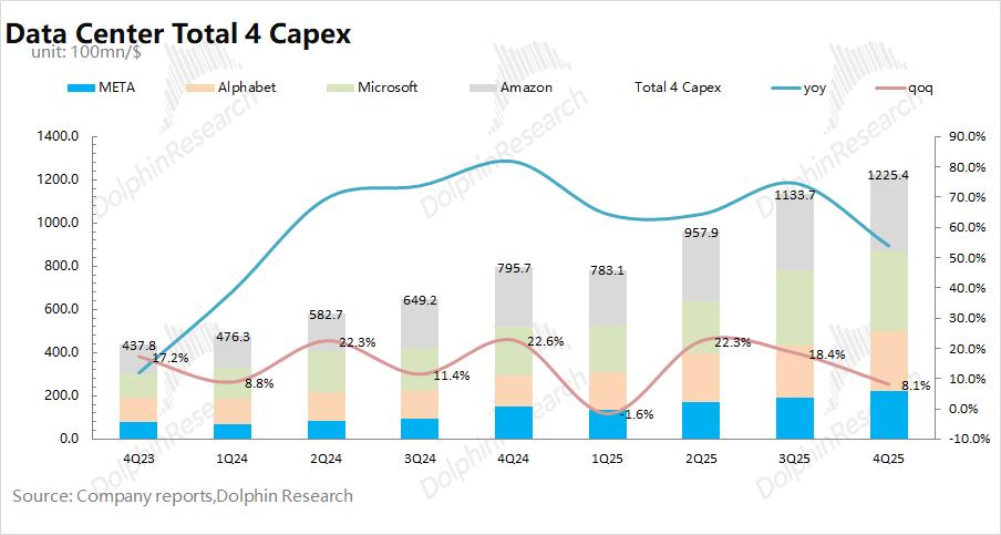 结合各家资本开支及展望,海豚君预计四大核心云厂商(谷歌、Meta、微软和亚马逊)在2026年的资本开支有望提升至6600亿美元以上,同比增长62%。