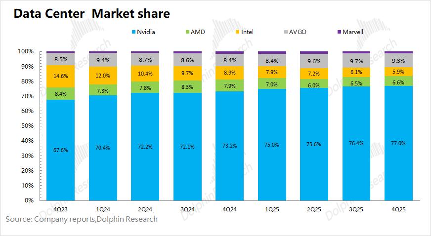 当前云服务厂商依然是公司AI芯片的最大购买方,因而下游云厂商的资本投入构成了公司数据中心业务增长的基础。而结合四家公司(谷歌、Meta、微软和亚马逊)的管理层交流,海豚君预期四大厂商在2026年的资本开支有望达到6600亿美元以上,同比增长62%,这也为公司2027财年的业绩高增长带来了保障。