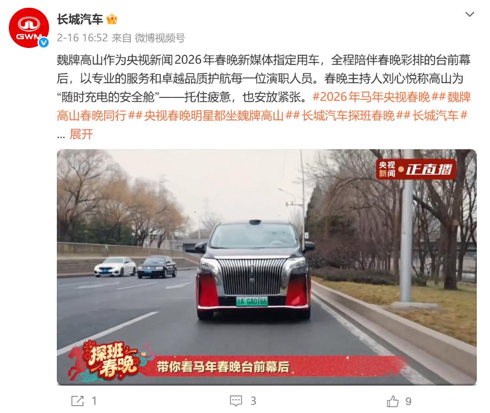 长城汽车旗下的魏牌通过将高山作为央视新闻2026年春晚新媒体指定用车,也出现在了直播时的很多镜头中。