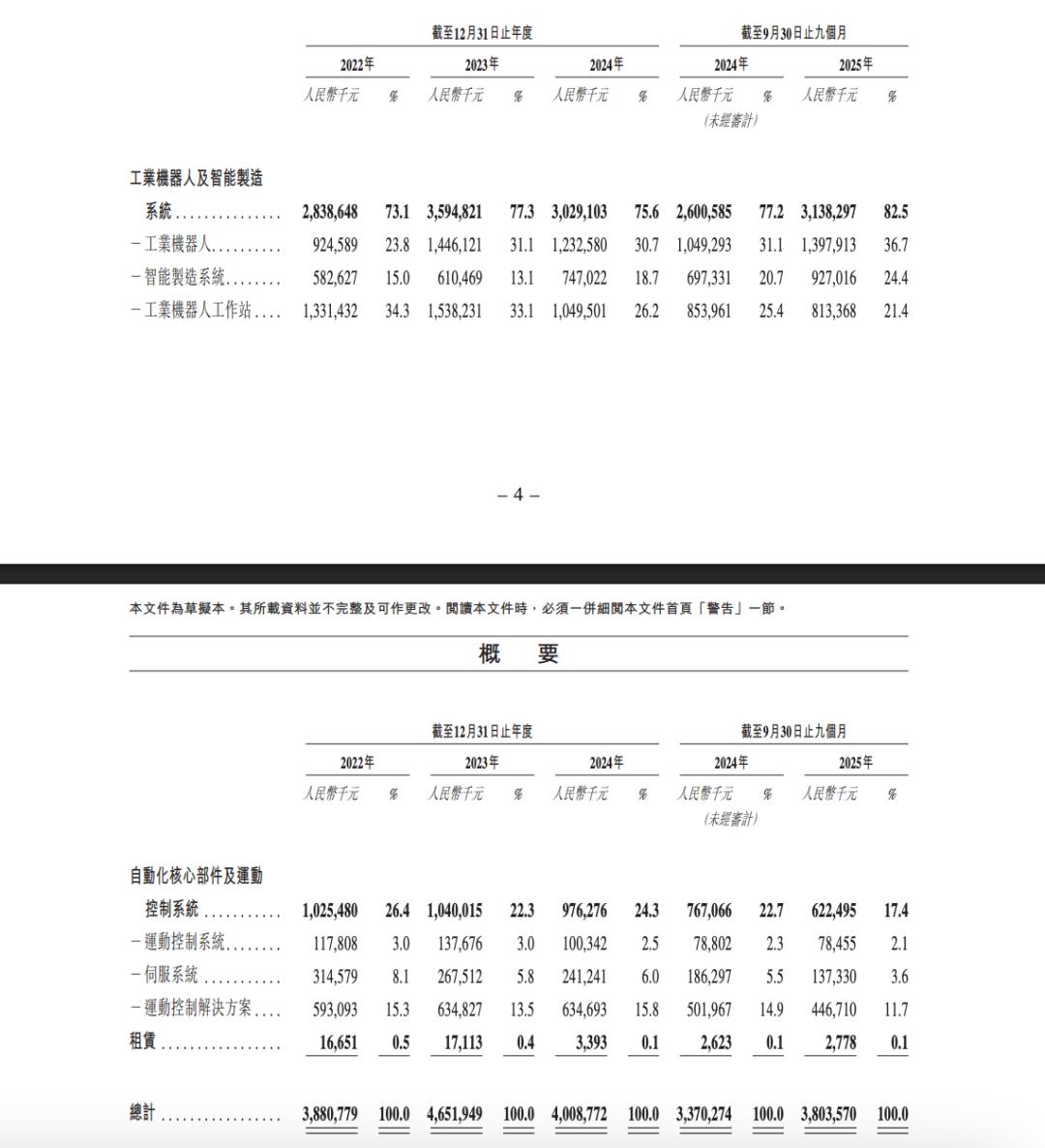 分业务来看,工业机器人及智能制造系统业务是其核心收入来源,近年来收入占比持续提升。2022年度、2023年度、2024年度、2025年前三季度,该业务板块占公司总收入的比例分别为73.1%、77.3%、75.6%以及82.5%。