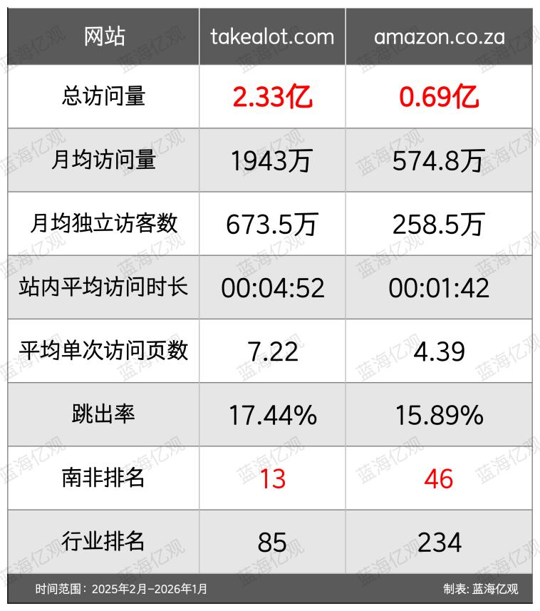 近一年(2025年2月-2026年1月),Takealot吸引了约2.33亿的访问用户,超过亚马逊南非站点(访问量约0.69亿)。