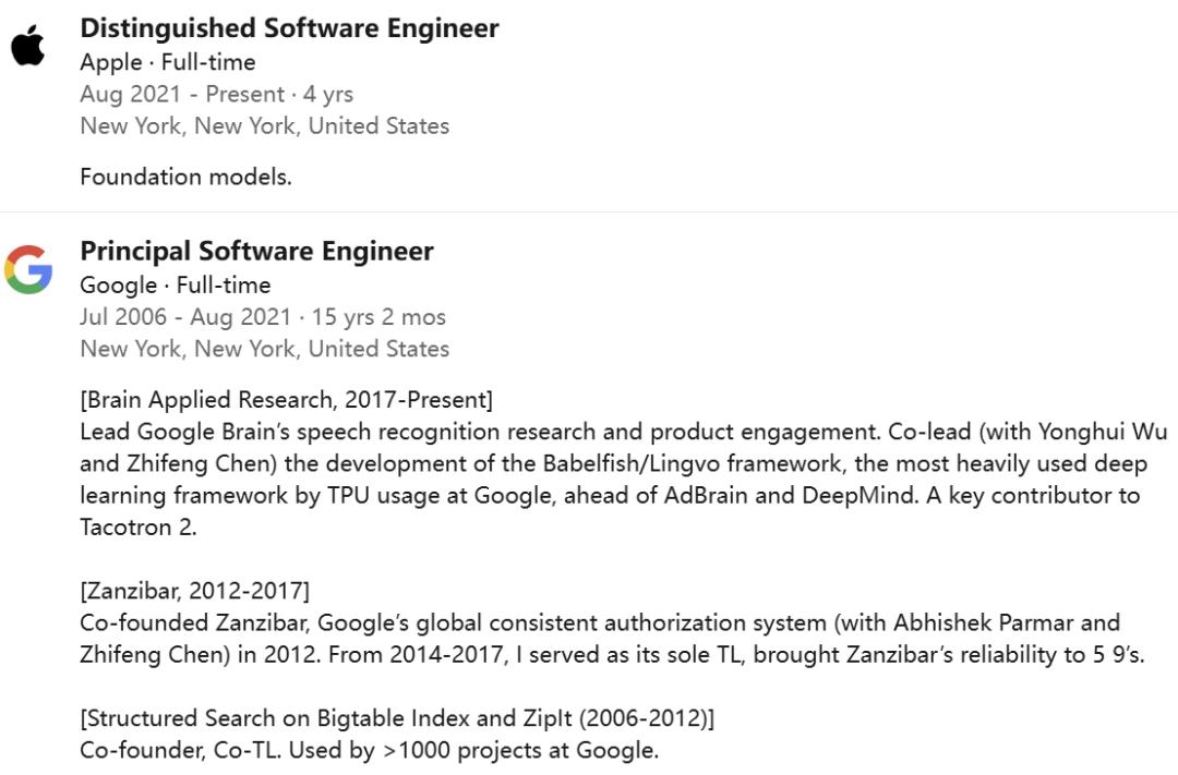 2021年,庞若鸣正式加盟苹果,任杰出软件工程师,领导基础模型研发团队(AFM)。