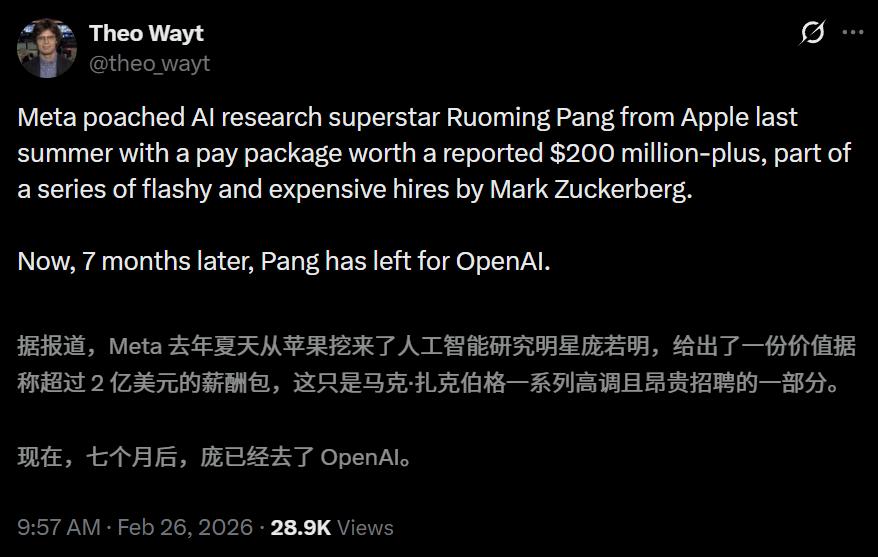 不过7个月,华人AI巨星庞若明从Meta,直接跳到了OpenAI。小扎曾为他开出高达2亿薪酬包,最终也没留住人才。