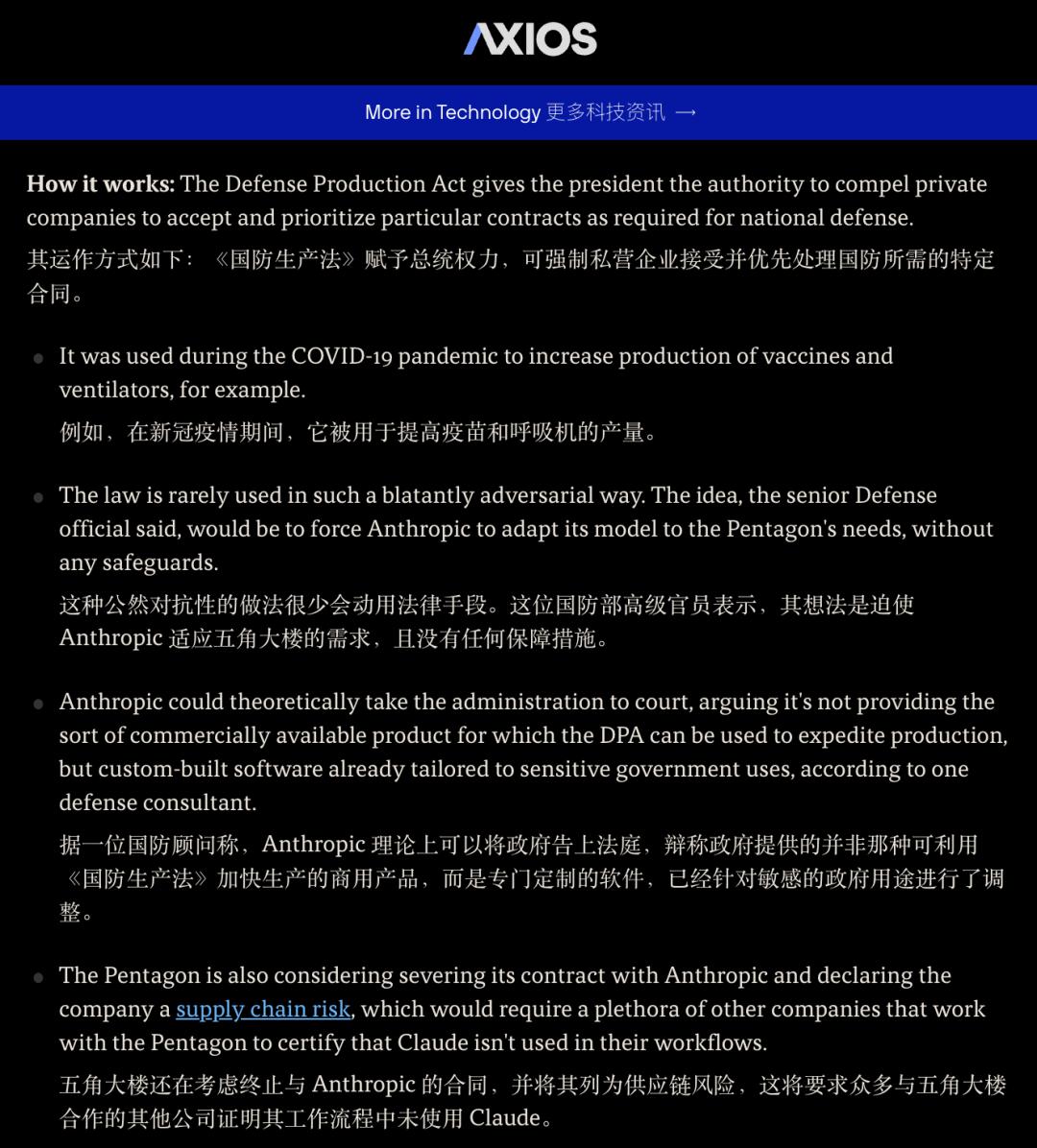如果 Anthropic 拒绝,五角大楼将考虑动用《国防生产法》(Defense Production Act)强制其修改代码,或者直接将其打上「供应链风险」的标签,彻底切断其与军方乃至其他联邦承包商的商业联系。