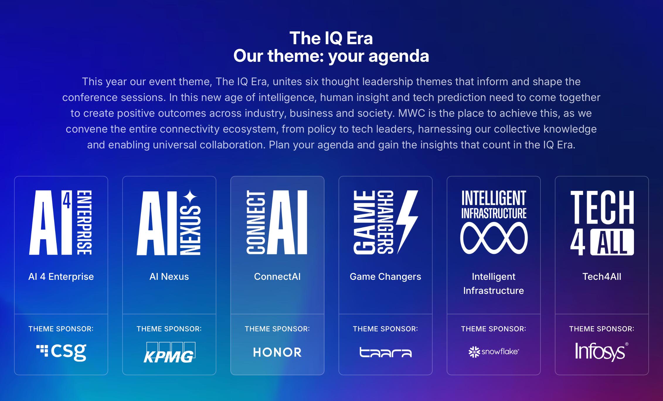 MWC26的主题很简单:The IQ Era,直译为「智商时代」,但是更准确地说是智能新纪元。整场活动将围绕Intelligent Infrastructure(智能基础设施)、ConnectAI(互联智能)、AI 4 Enterprise(AI 赋能企业)、AI Nexus(AI 中枢)、Tech4All(科技普惠) 和 Game Changers(变革者)等6大核心主题展开。
