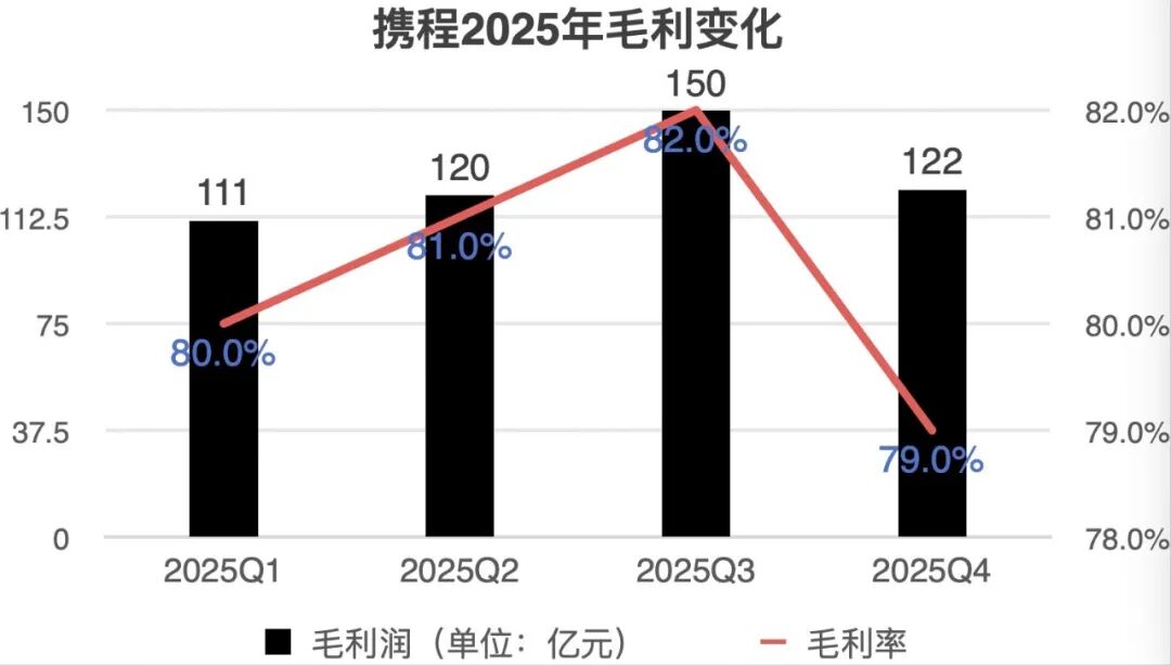 毛利率也相当惊人。按2025年各季度来看,携程毛利率分别为80%、81%、82%、79%。从全年来看,2023年-2025年,其毛利率分别为82%、82%、81%。