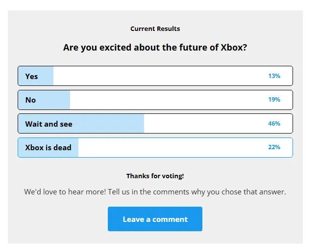 结果格外真实,也格外讽刺:只有13%的人还抱着期待选择Yes,19%的人直接摇头说不,22%的人更是直言“Xbox已死”,剩下将近一半的人,都在沉默观望。