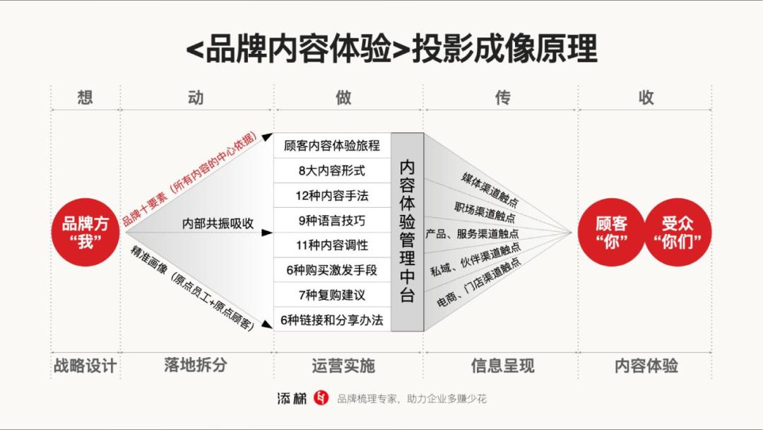 然后内部共振吸收,大家互相认可,再通过各种内容手段运营实施,来到内容体验管理中台。经过中台的过滤,再进入到各种触点,发送到顾客和受众端。