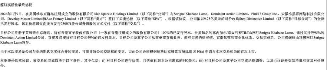 或许正是在这一系列背景下,尽管“Rich Sparkle Holdings”收购“Step Distinctive”时,宣传文章中提到,“根据协议,未来36个月内,本公司将与三只羊系统合作,在全球范围内拥有Khaby Lame的全链接独家商业运营权”;同时其在SEC文件中称“交易完成后,公司将继续由顶级网红Khabane Lame(无语哥)领导。”出现了三只羊“借壳上市”的猜想。