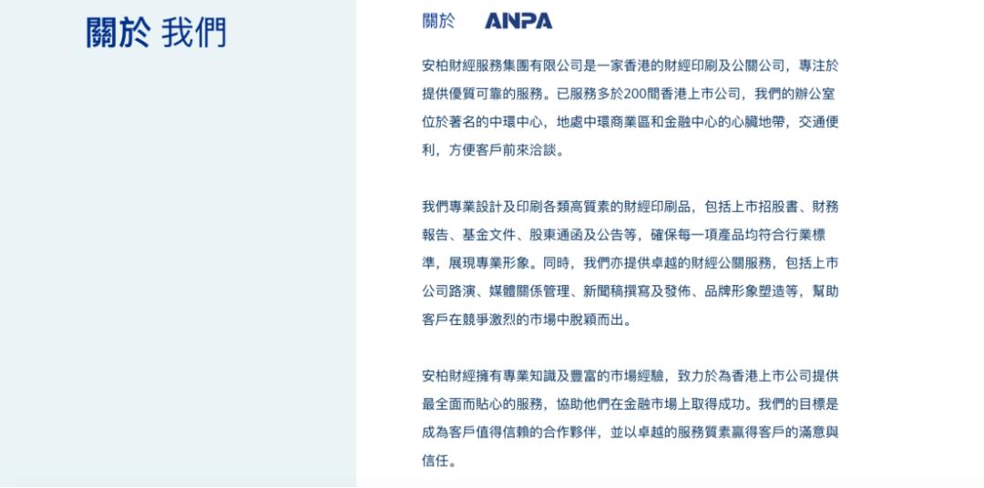 而位于香港的安柏财经,公开资料显示其专注于“提供广泛的金融印刷服务,如排版、校对、翻译、设计和印刷”。
