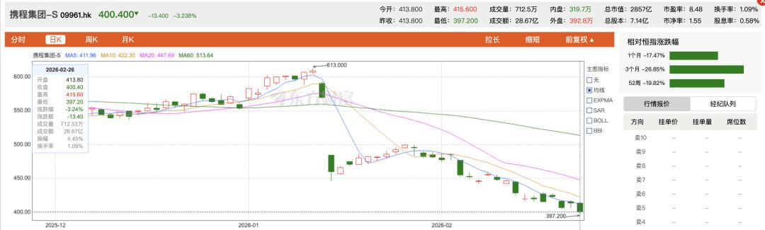 2月26日港股开盘,携程低开低走,盘中最低触及397.2港元/股,创下52周新低。当天,携程每股收报400.4港元,下跌3.24%。