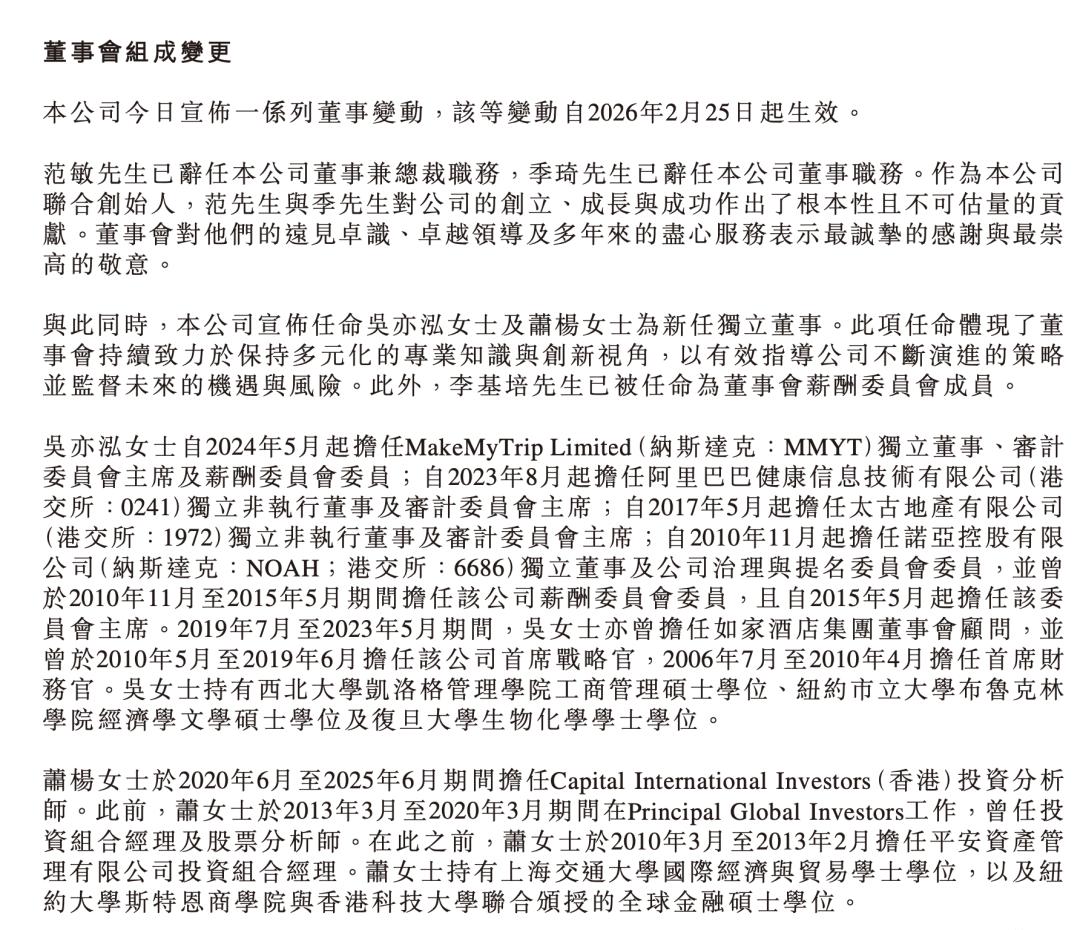发布年报的同一天,携程宣布,联合创始人范敏辞任董事兼总裁,季琦亦辞任董事,任命吴亦泓女士及萧杨女士为新任独立董事,李基培已被任命为董事会薪酬委员会成员。自此,携程告别“创业元老主导”时代,进入由职业经理人与专业董事构成的新治理阶段。