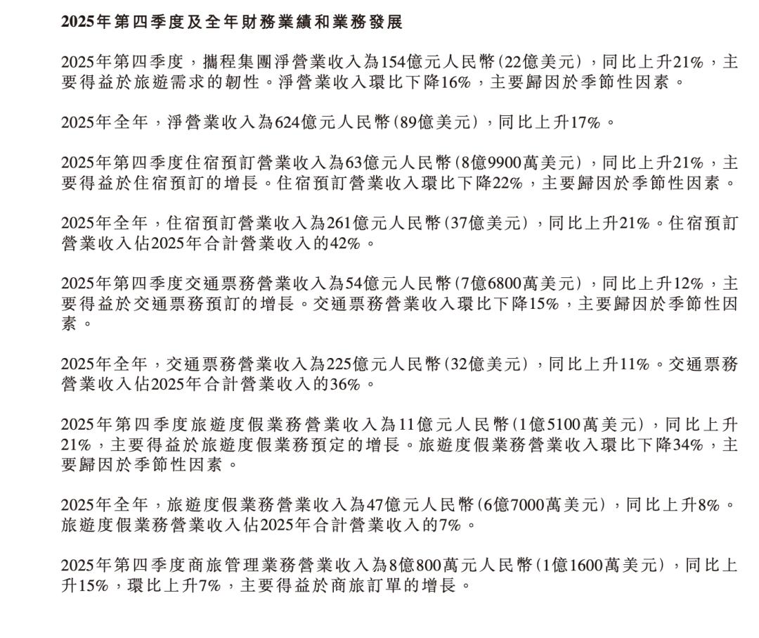 根据年报披露,2025年全年净营业收入达624亿元,同比增长17%。其中,住宿预订收入261亿元,同比增长21%,交通票务225亿元,同比增长11%,旅游度假47亿元,同比增长8%,商旅管理28亿元,同比增长13%。