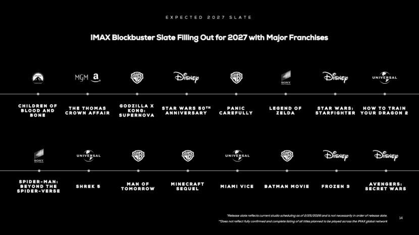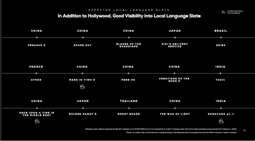 凭借着直至2029 年的强劲片单和观众对IMAX 体验的强劲需求,IMAX预计2026年全球票房将达到14亿美元。