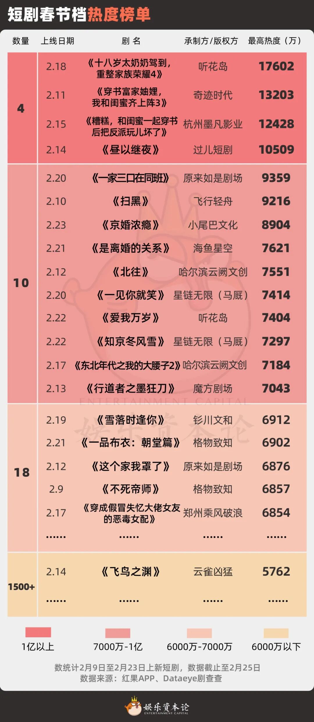 电影春节档票房同比大跌四成,而短剧春节档却默默占领了沉默的大多数:热度过亿的短剧从去年的1部增至4部,数量翻了4倍。听花岛的《十八岁太奶奶4》以1.7亿热度登顶,3天播放量破10亿,档期内共有3部破10亿短剧。7000W以上的高热度爆款短剧比去年同期多了三倍以上。短剧演员张翅也依靠两部爆款剧角色,两周内涨粉87万。