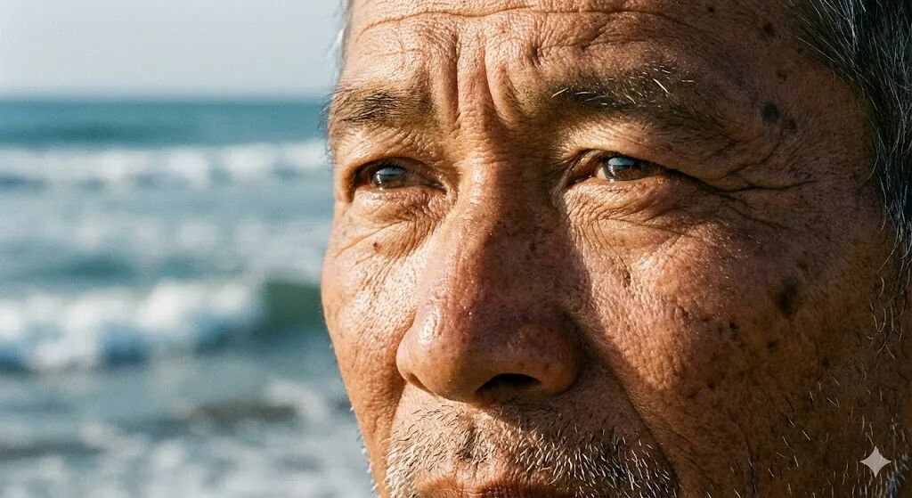 Nano Banana Pro生成,提示词:一位年约60岁的亚洲渔夫的超高清面部特写,海浪作为背景虚化。他脸上布满饱经风霜的皱纹和晒斑,皮肤纹理极其细腻,能看到细小的毛孔和银色的胡茬。阳光从侧面45度打来,照亮他半张脸,眼睛微眯,眼神中透露出坚毅与平静,眼球表面映出远处海平面的反光。画面锐度极高,皮肤质感真实到仿佛能触摸到。