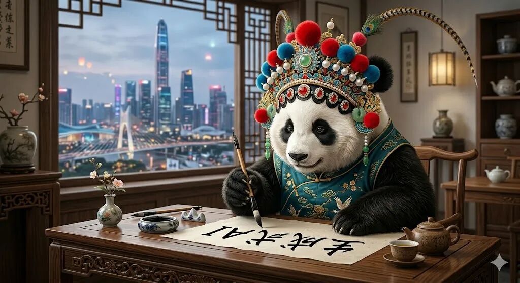 智东西用Nano Banana 2生成的图片,提示词:一只戴着中国传统京剧头饰的可爱大熊猫,正坐在现代中式茶馆里,用毛笔在宣纸上书写汉字“生成式AI”。要求熊猫的毛发丝丝入扣,头饰上的珠翠和绒球质感真实,写出的毛笔字“生成式AI”笔锋流畅且没有错别字。茶馆窗外是模糊的未来都市景象(深圳天际线)。画风要求是超写实摄影与工笔画融合的风格。