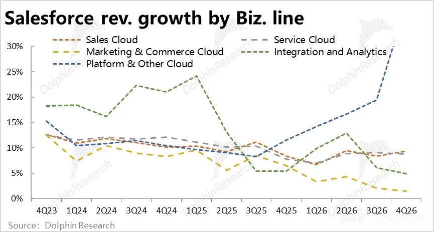 分业务线看,除了吸纳了 Informatica 的平台云增长大幅提速外,其他各业务线的增长(不变汇率下)普遍环比走低,最好也就是持平。可见,虽然此前公司的指引预期营收增长会触底回升,但截止本季度并无多少提现。
