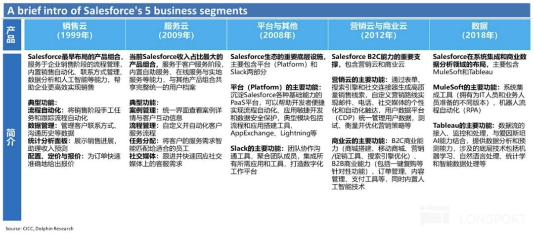 ⑤ 平台云(Platform & others):Salesforce 其他 SaaS 服务依赖的基础设施和服务,类似 PaaS(Platform-as-a-service)。也包含类似于微软 Teams 的团队协作 SaaS 服务 Slack。