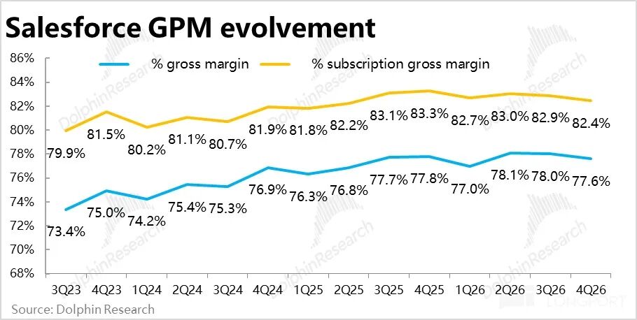 单看核心订阅业务,本季毛利率为 82.4%,环比走低约 0.5pct,同比更是收缩了近 1pct。海豚君认为,很可能是 Agentforce 等对后台算力要求较多因此毛利率偏低的 AI 相关业务的拖累。