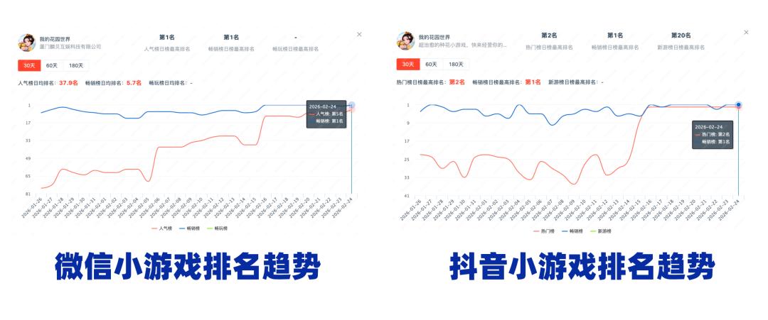 小游戏方面, 《我的花园世界》完成了对老牌头部产品的弯道超车,目前已超越《无尽冬日》《三国:冰河时代》《向僵尸开炮》等长期霸榜的经典产品,同时占据抖音小游戏、微信小游戏两大核心平台的畅销榜榜首位置。此外,其在微小人气榜、抖小热门榜中,也处于持续攀升的状态。