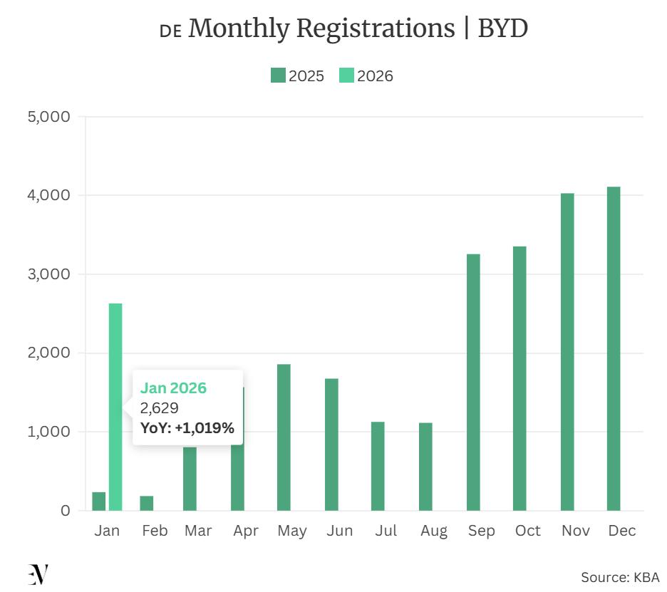 反观中国品牌,不仅在中国市场挤压德系车,同时也在德国本土市场高歌猛进,比亚迪2025年在德交付23306辆电动车,同比增长706.2%,2026年1月销量更是激增1000%以上,还计划年底前在德布局超350家经销商,冲击年销5万辆的目标。一降一升之间,中德汽车产业的竞争力对比已然清晰。