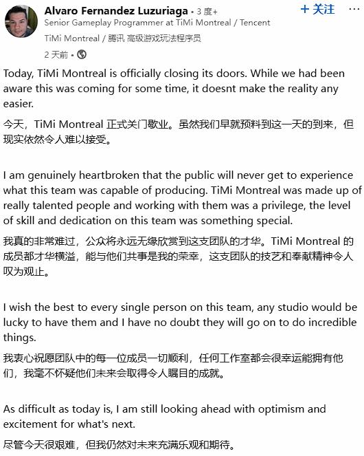 “我为公众无缘欣赏到这支团队的才华而感到遗憾。天美蒙特利尔的每一位成员都才华横溢,且团队的技术、奉献精神令人惊叹。”