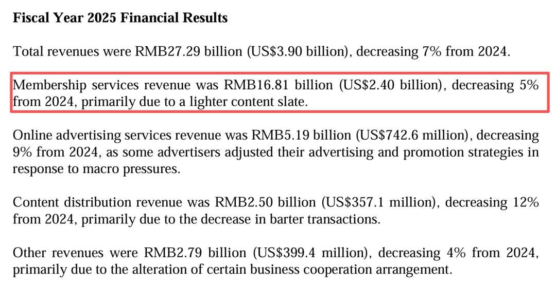 更愁的是会员服务的下滑。财报显示,2025年其会员服务收入为168.1亿元,同比下滑5%。作为第二大板块,在线广告服务同样面临下滑压力,2025年营收为51.9亿元,同比下滑9%。