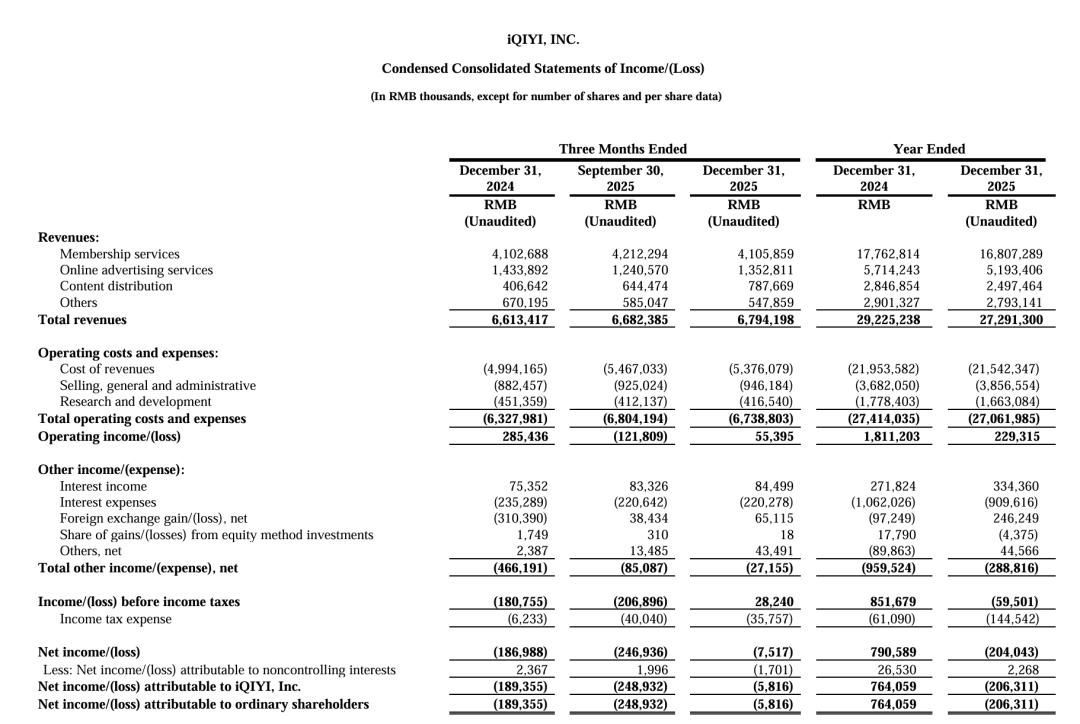 不过,成本管控的成效未能抵消营收下滑的影响,2025年爱奇艺盈利指标出现明显恶化。